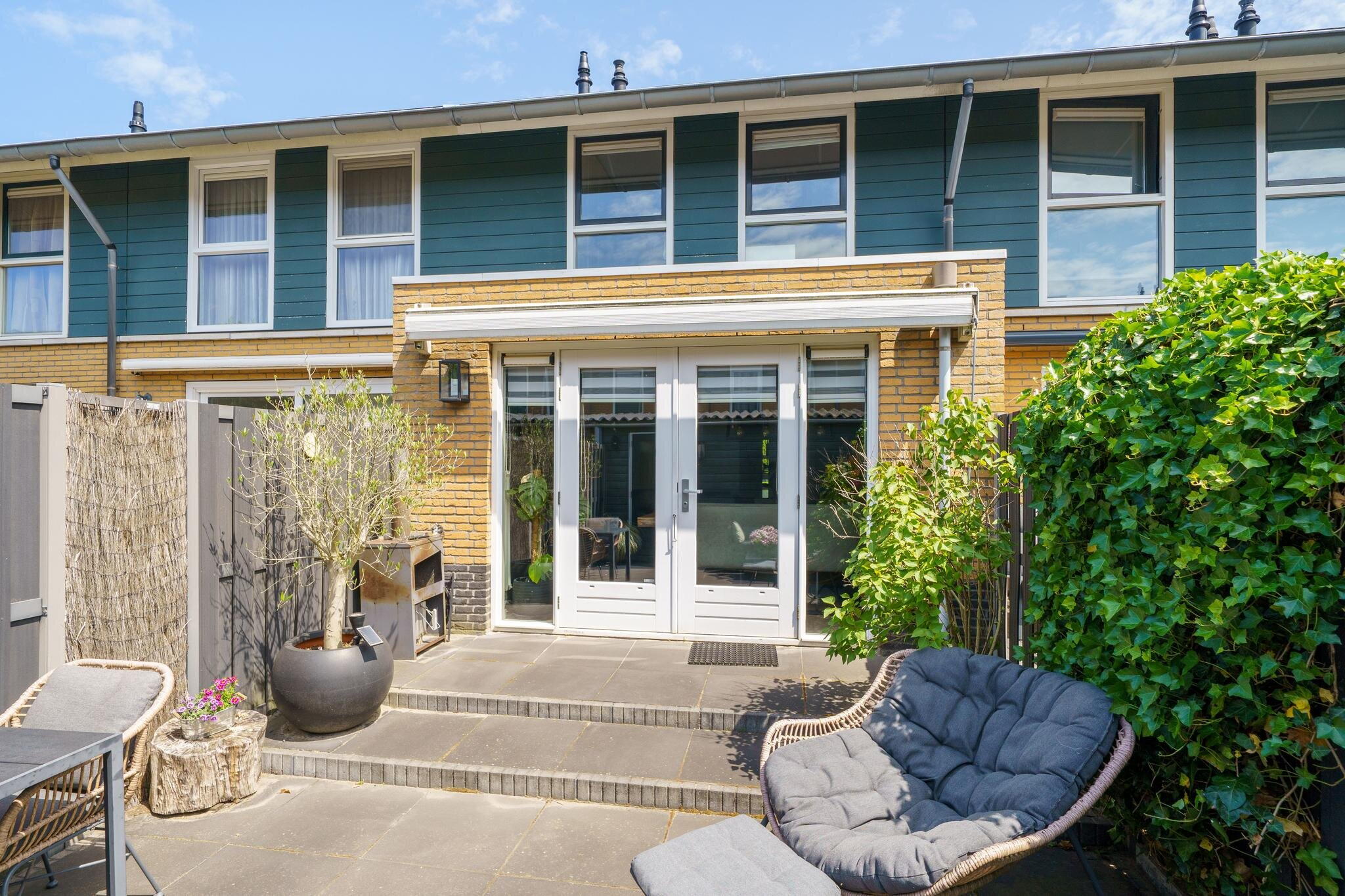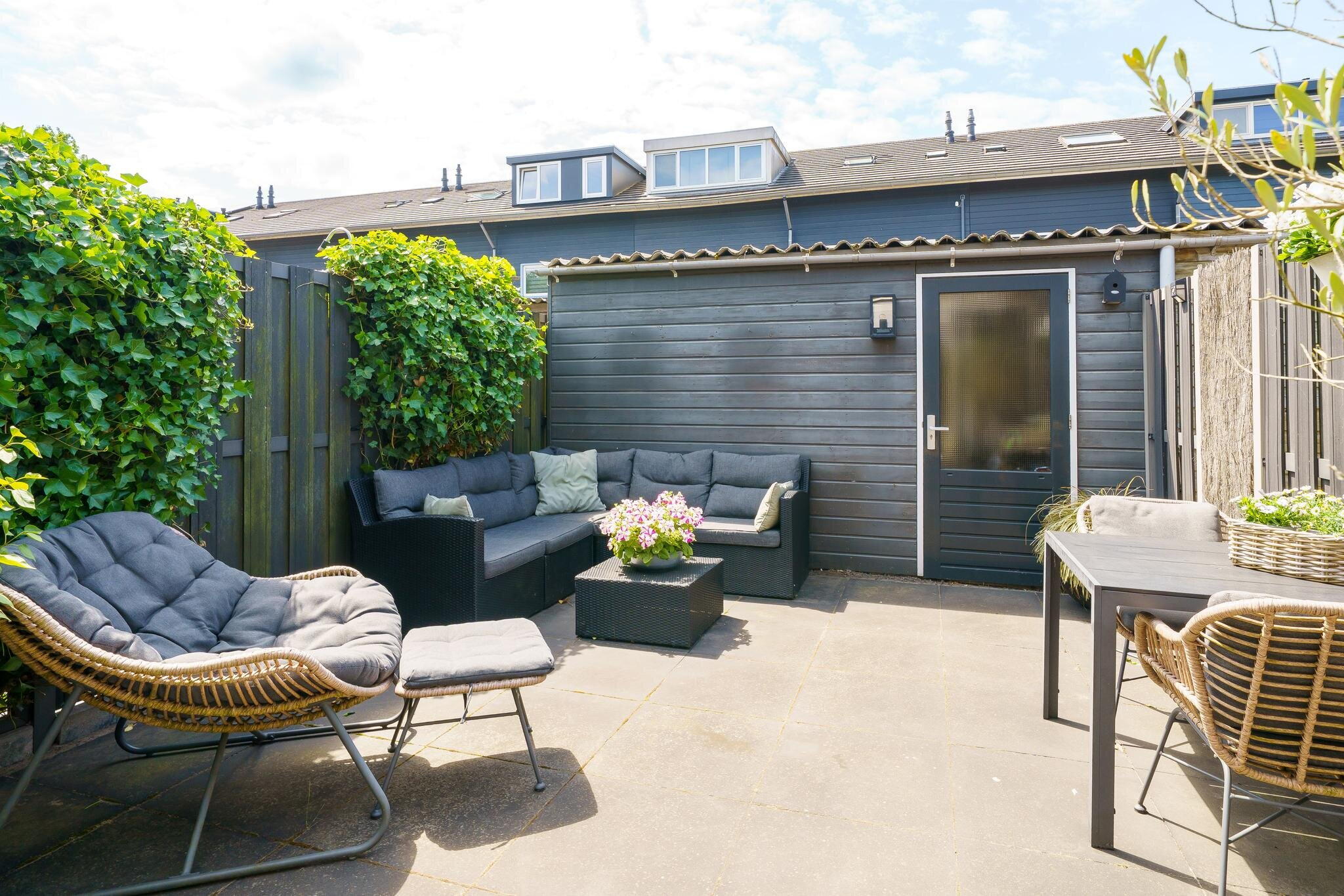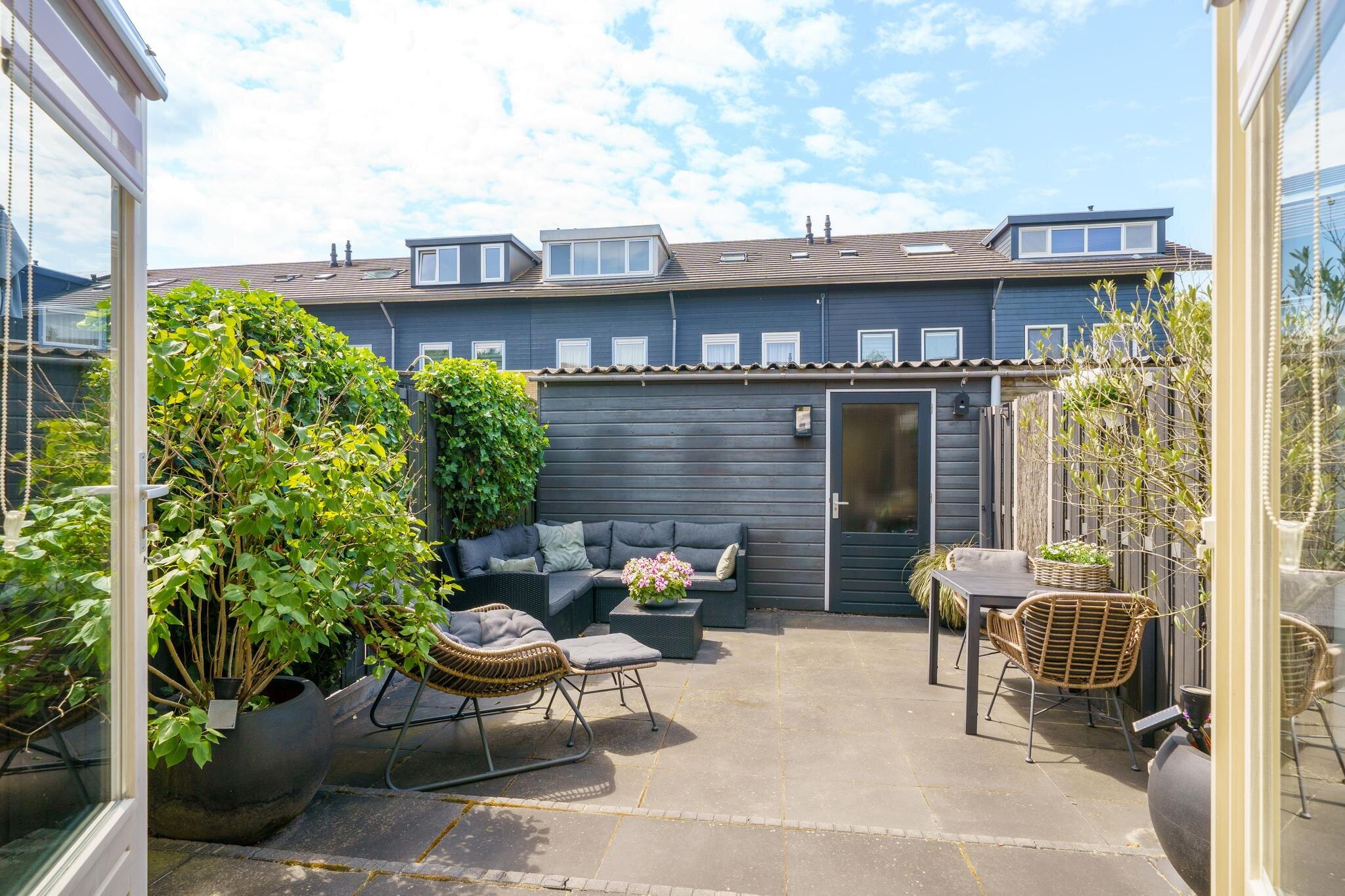 De achtertuin is gelegen op het Zuidwesten, het is dus fijn dat er reeds een zonnescherm aanwezig is. De tuin is sfeervol aangelegd met sierbestrating, schuttingen, buitenkraan en een grote berging over de gehele breedte van de tuin. De berging is v.v. elektra en een deur naar de achtergelegen steeg. Ideaal voor bijvoorbeeld een scooter of motor.
